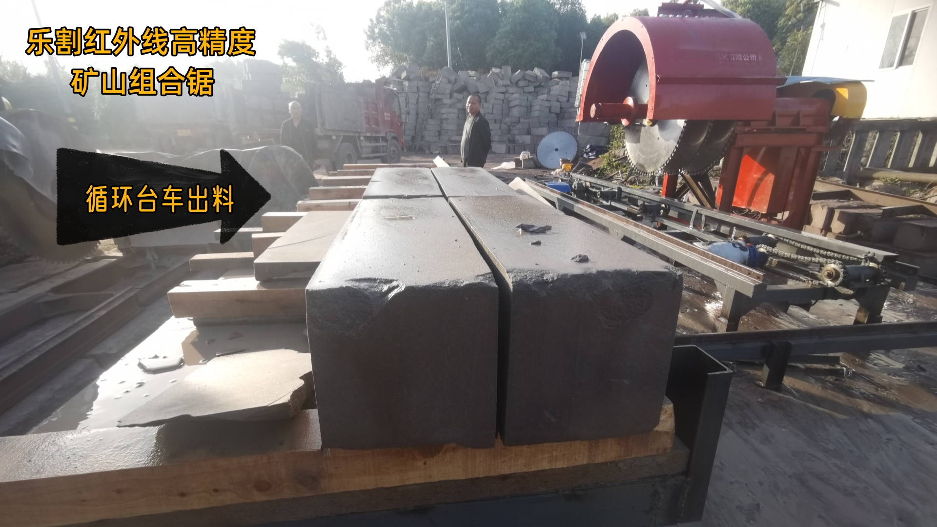 型號石具體的做法如下:比如您需要25*25*120的成品尺寸。第一步礦山上打25公分的小線,120公分的大線,切割過程中用單片或者我們的雙片礦山機打水平完成誤差小一些,深度能切1米算一米。第二步將石料平放在我們的循環料車上紅外線對刀,組合鋸掛5片間隔25公分,一刀過去就成型,并且這一刀的精度是毫米級的,料車上循環的,用人也就一個上下料的一個看料車的即可!砂巖和油光石用這種做法完全沒有問題。鋸片間隔距離也是隨時可以調整的。還有礦山上打小線比加工廠快的多,當然也可以用我們設備開小線再翻料過來切割,還可以在我們我們生產線上增加定長的橫向切兩頭的機器。